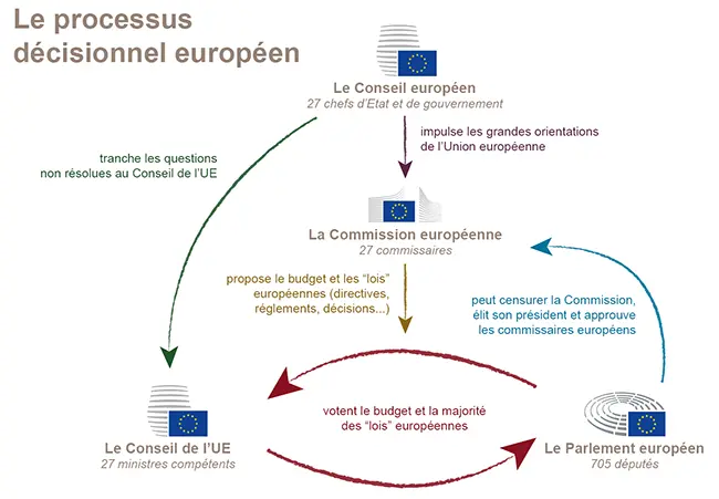 La prise de décision au sein de l'Union européenne fait intervenir quatre principales institutions : la Commission européenne, le Parlement européen et le Conseil de l'Union européenne. Ensemble, elles forment le "triangle institutionnel" européen.